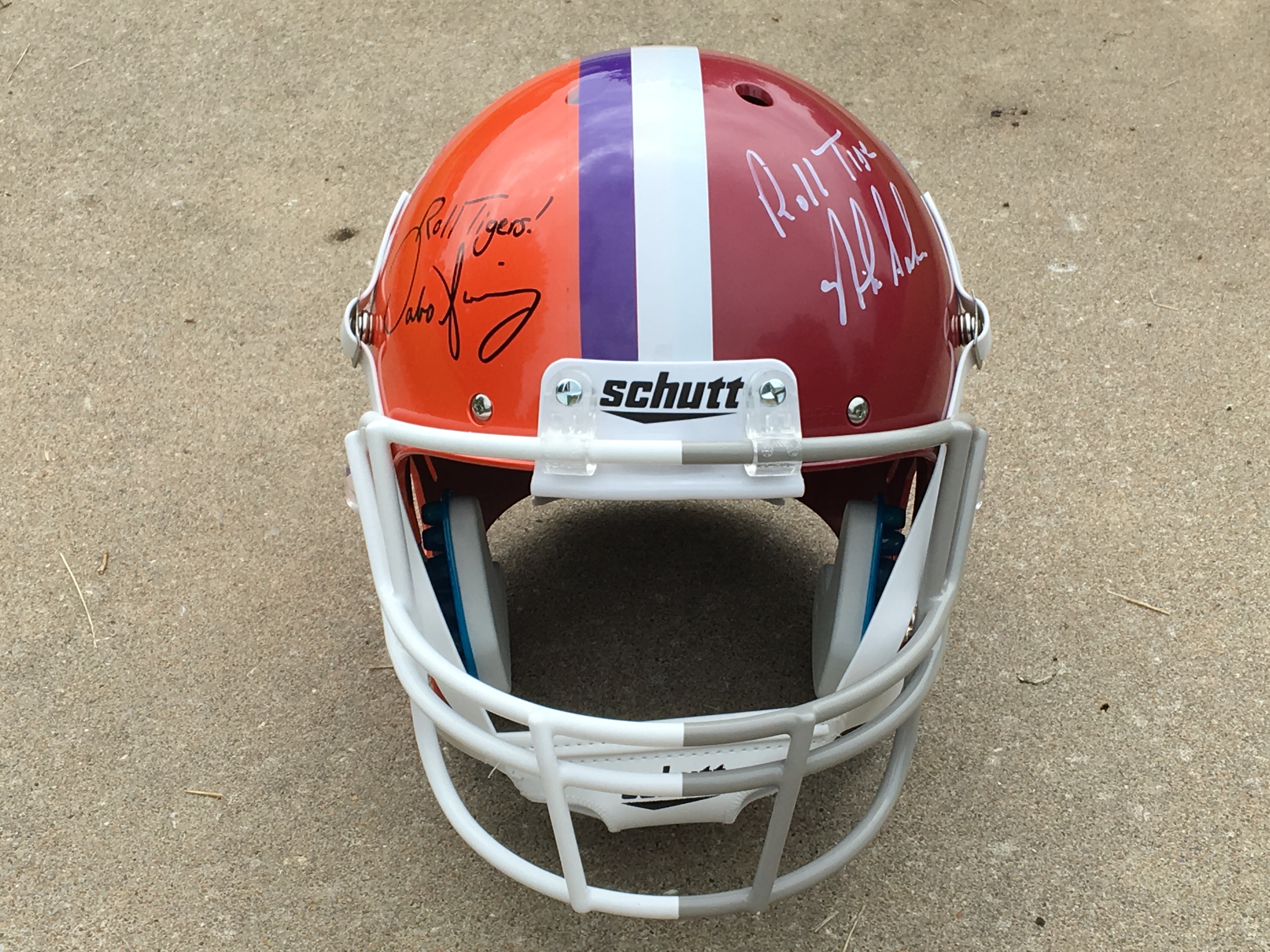 Roots run deep.  After competing against each other in the 2016 College Football Playoff National Championship Game, Dabo Swinney and Nick Saban teamed up to raise funds for the Rise School at the Stallings Center in Tuscaloosa, through hosting a golf tournament at TBD.  The Rise School services serves young children with physical disabilities from birth to 5 years of age.   The tournament was a great success.  Tournament Director John Staples was looking for a signature item to reward those teams that participated and he turned to Devotion Sports to create a half Clemson/half Alabama full size helmet from Schutt Sports that was autographed by both coaches.  Never forgetting where he came from, Coach Swinney signed “Roll Tigers” on the Clemson side of the helmets.   With such capacity to do good while competing relentlessly, here’s hoping for another Tide-Tigers rematch.